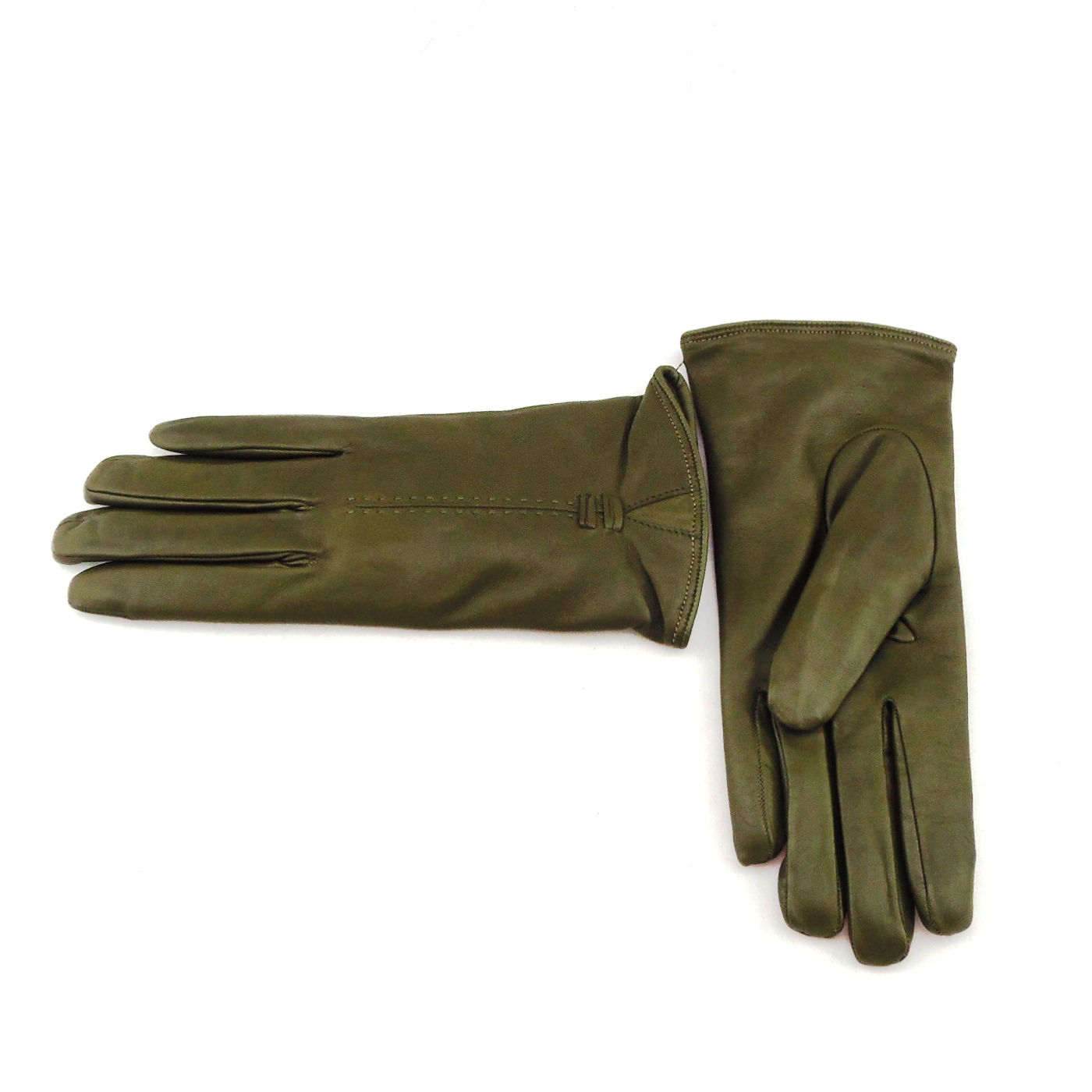 Realizzato in pelle nappa di vitello di prima scelta, ha la classica forma del guanto affusolato ed elegante. Viene decorato da una sottile arricciatura sul dorso della mano e da due piccoli fiocchi sul dorso.